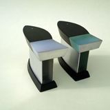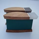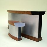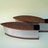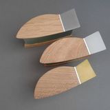 The simple form of a fish shape came naturally when using aluminium. Aluminium can not be soldered but need to be assembled otherwize. The aluminium is folded and shaped over a wooden mould, the two ends are then connected with a piece of resin, wood or perspex. I often leave the aluminium raw and brushed, which gives a calm and cool background to the wood.
